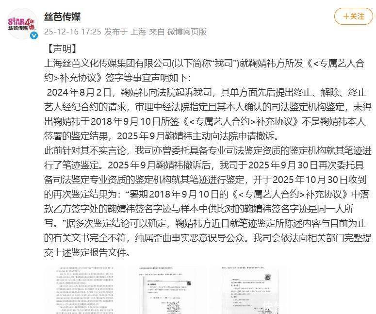 鞠婧祎撕合约,丝芭晒账本,谁在说真话?鞠婧祎提到她和丝芭传媒的合同月就已经到期,她还指出公司伪造了她的签名和授权文件,这件事影响很大,但丝芭传媒不承认这个说法,他们拿出一份笔迹鉴定报告,声称那些签名是真实的,双方各说各的理,互相无法说服对方。