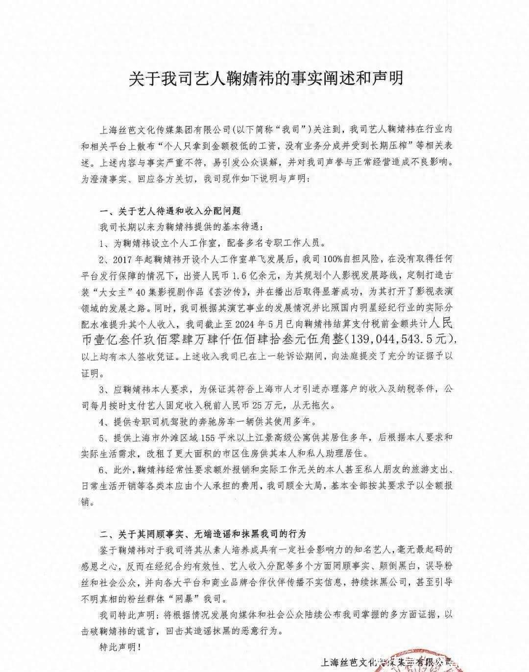 丝芭传媒:已向鞠婧祎支付亿元